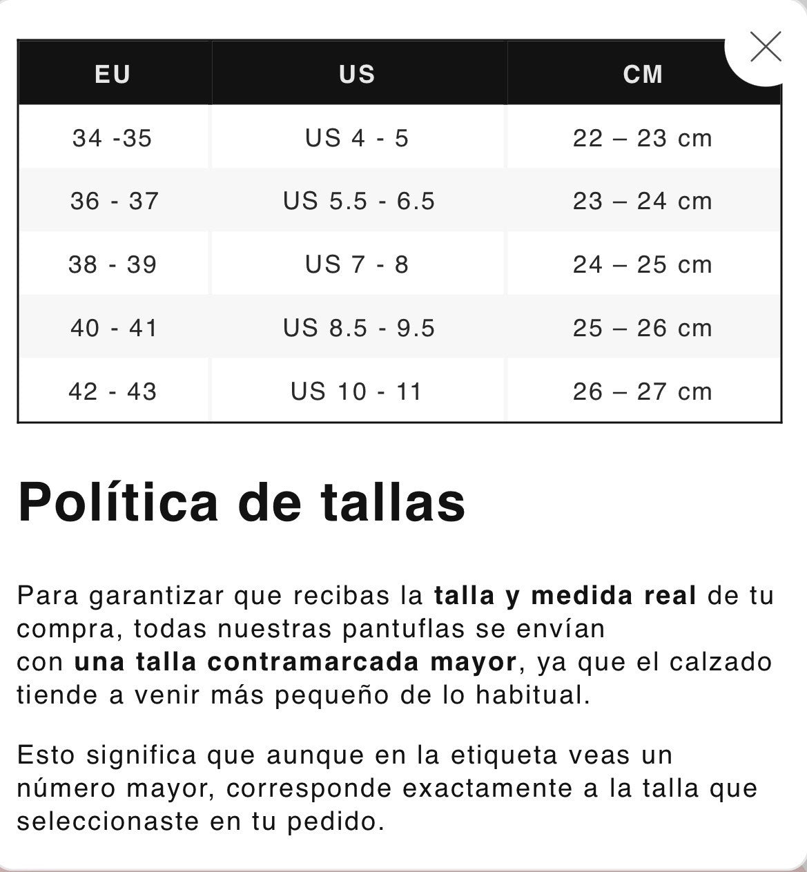 Para garantizar que recibas la talla y medida real de tu compra, todas nuestras pantuflas se envian con una talla contramarcada mayor, ya que el calzado tiende a venir mas pequeno de lo habitual.